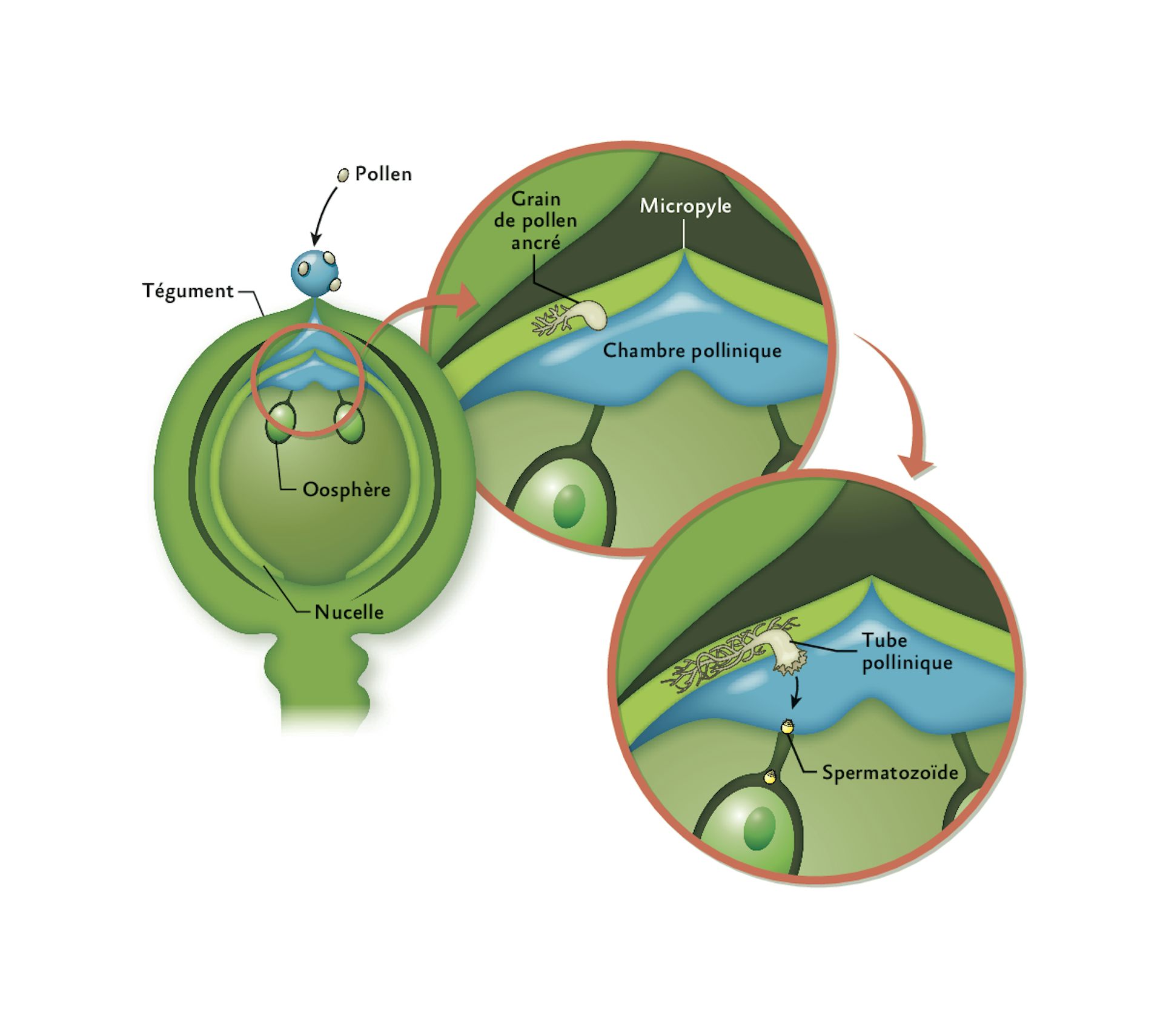Mais dans le cas du ginkgo, qui est pourtant bien un arbre adapté au milieu aérien, la fécondation reste aquatique. L’ovule est creusé d’une chambre pollinique emplie d’un liquide qui surplombe la tête des oosphères (schéma). Les grains de pollen entrent au printemps dans l’ovule encore tout petit, par un petit trou, le micropyle, qui perle une goutte d’eau collante se rétractant à l’intérieur. Des grains de pollen entrés dans l’ovule germent alors un court tube pollinique qui s’ancre dans le mur de la chambre et ce n’est que quelques semaines plus tard que le grain libère son contenu dans le liquide, des spermatozoïdes nageurs car pourvus de cils vibratiles. Ils nagent vers les oosphères au fond de la piscine pour s’unir à elles.