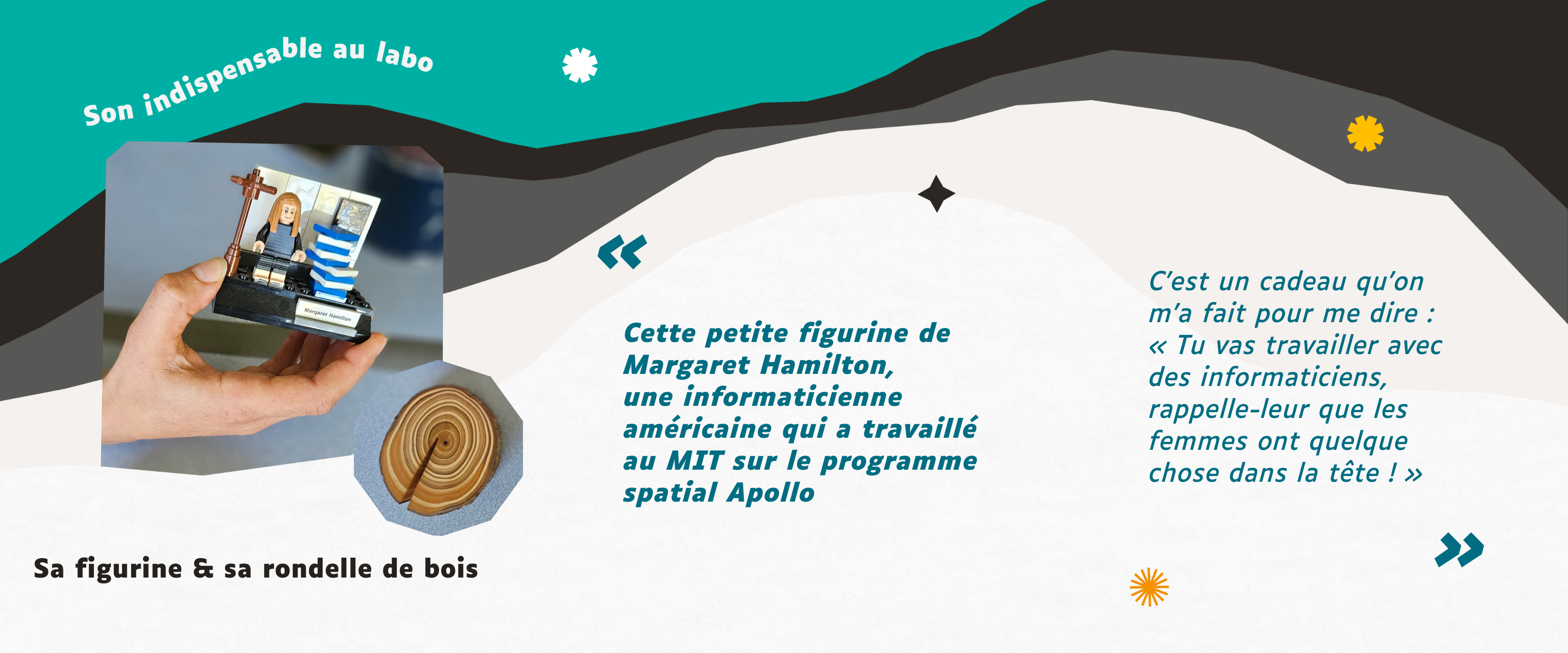 L’entretien touche à sa fin. Au moment d’opter pour un objet qui accompagnera son portrait, Nadia Goué hésite entre une rondelle de bois aux cernes bien visibles et une figurine lego de l’informaticienne américaine Margaret Hamilton. L’un et l’autre, posés sur son bureau, ne la quittent jamais. À eux deux, ils résument bien son parcours, comme son métier de bioinformaticienne. Alors pourquoi choisir ?
