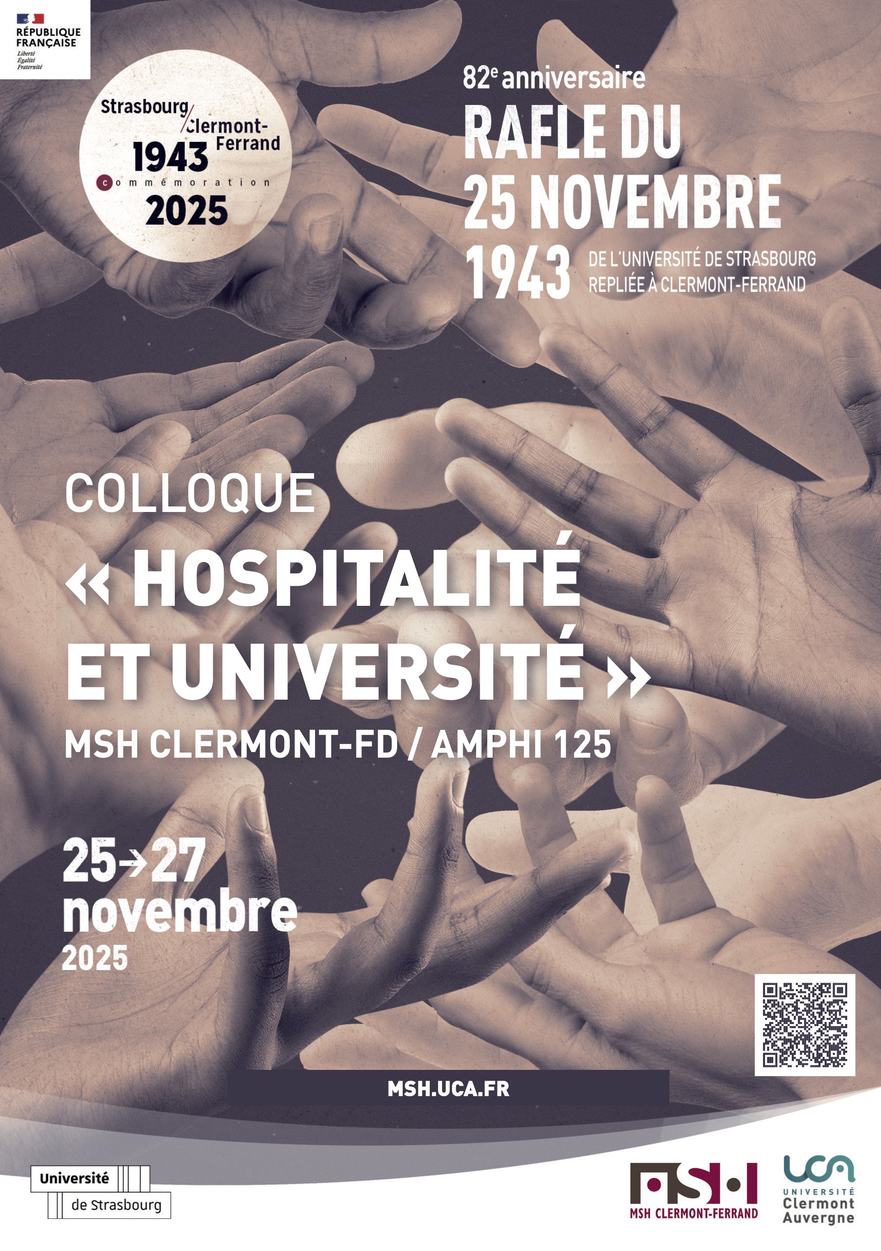 L'Université Clermont Auvergne et l'Université de Strasbourg commémorent cette année le 82ème anniversaire de la Rafle du 25 novembre 1943. Dans le cadre de cette commémoration, le colloque scientifique, interdisciplinaire et international « Hospitalité et université. Histoire et pratiques de l'accueil des étrangers » se tiendra à la Maison des Sciences Humaines de Clermont-Ferrand (amphi 125) du 25 au 27 novembre.